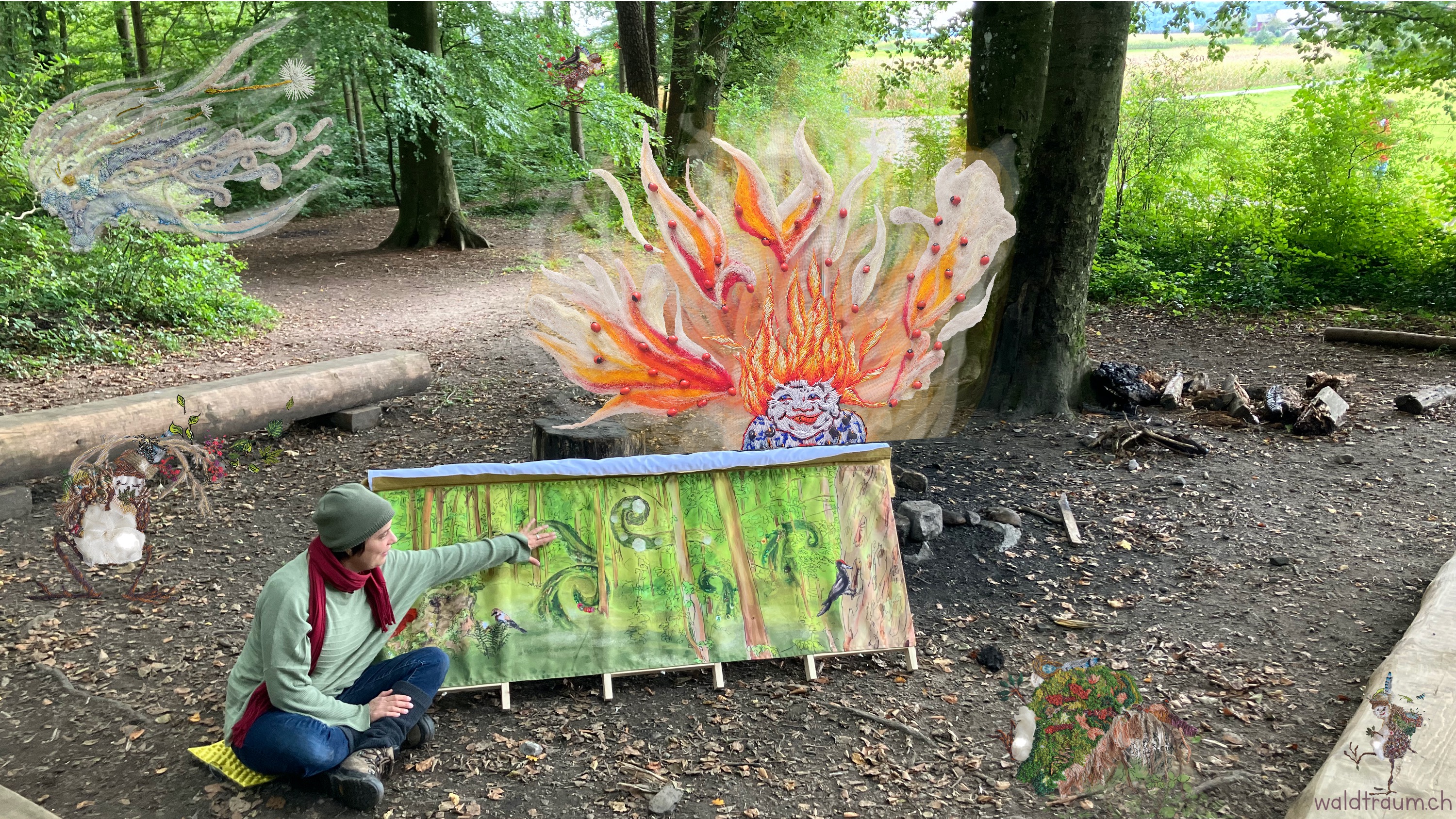 Das Riesenbilderbuch aus Stoff, das für Workshops vor Ort gebucht werden kann, bietet eine Alternative zum Beamer – im Schulzimmer oder im Wald.