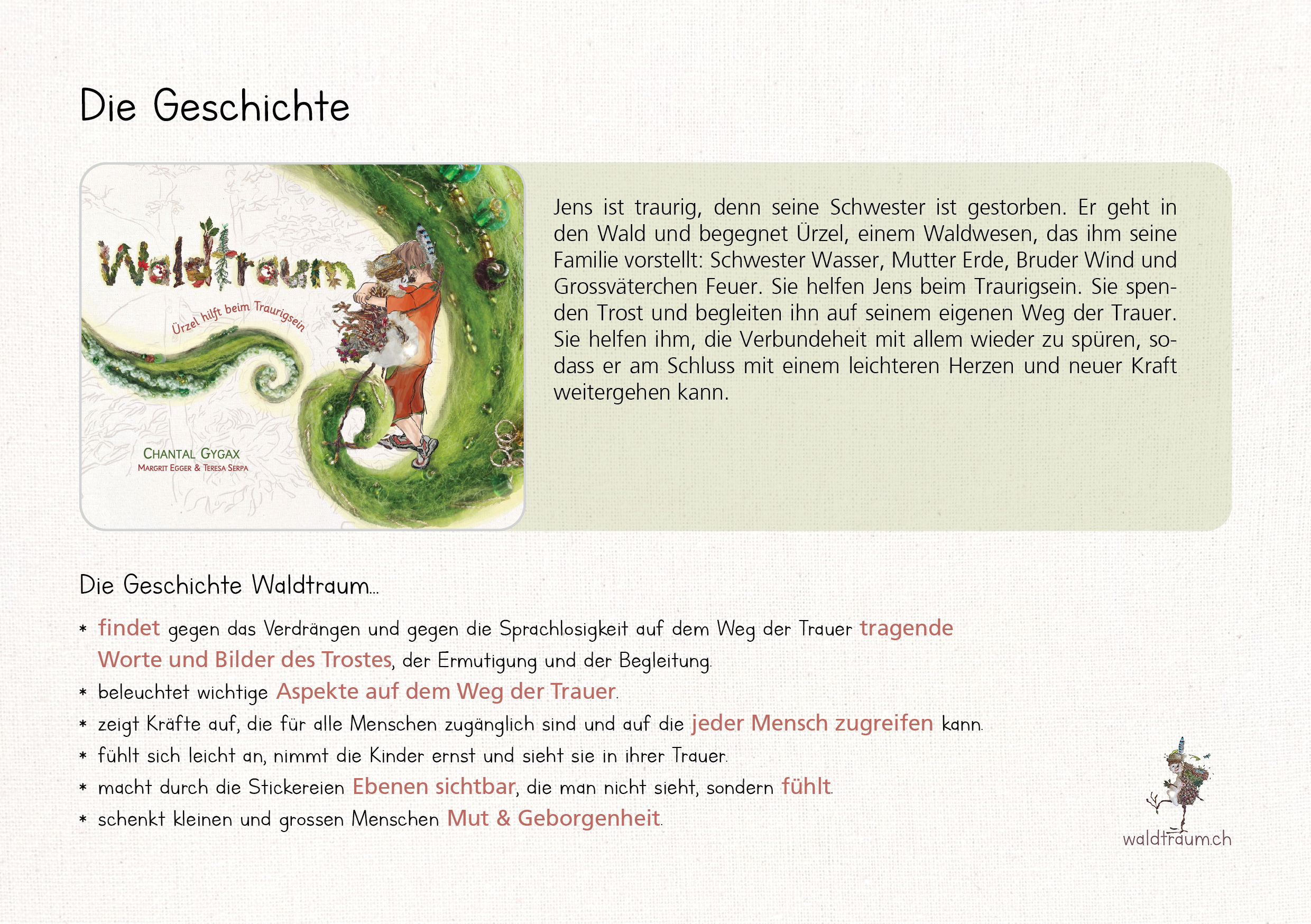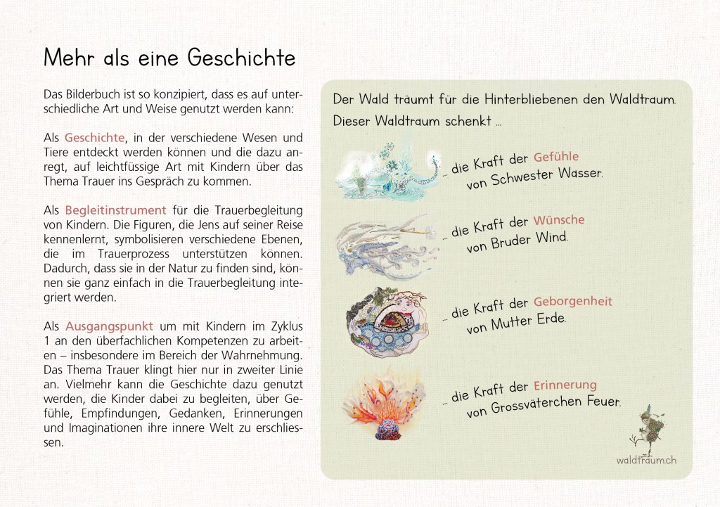 Mit der Geschichte des Bilderbuches «Waldtraum» in das Thema «Traurigsein» eintauchen. Die Geschichte bezieht die Ebene des Körpers, der Gedanken und Gefühle stark mit ein und bietet zahlreiche Möglichkeiten mit Kindern kreativ und lustvoll das Thema «Traurigsein» zu behandeln. Alternativ kann das Bilderbuch als Ausgangspunkt dienen, um mit Kindern im Zyklus 1 an den überfachlichen Kompetenzen zu arbeiten, vor allem im Bereich der Wahrnehmung. Hierzu bietet sich der Wald als Ort sehr gut an.
